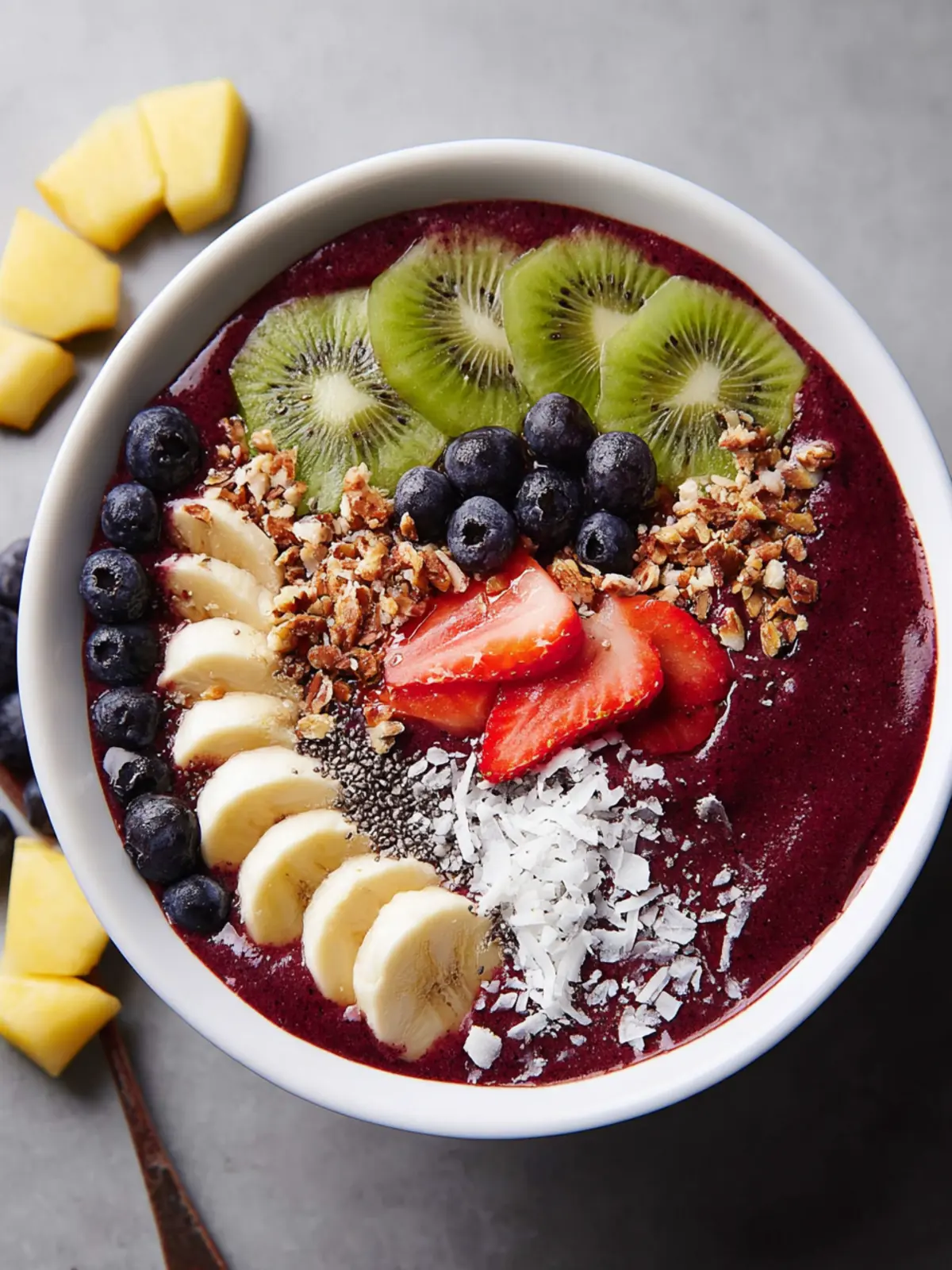 A refreshing acai berry bowl topped with granola and fresh fruit.