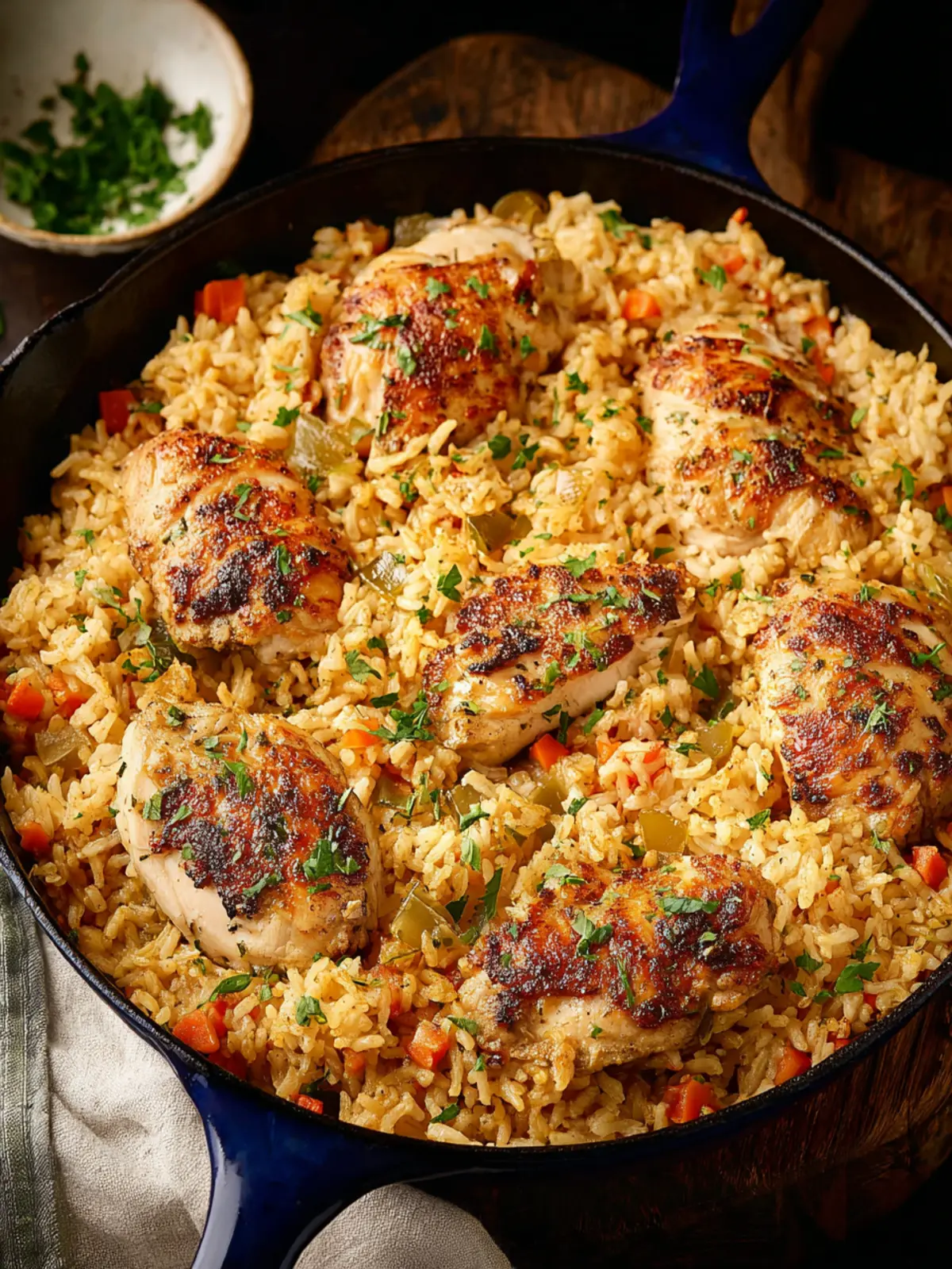 - Add chicken: Rub the chicken thighs with seasoning and nestle on top of the rice.
