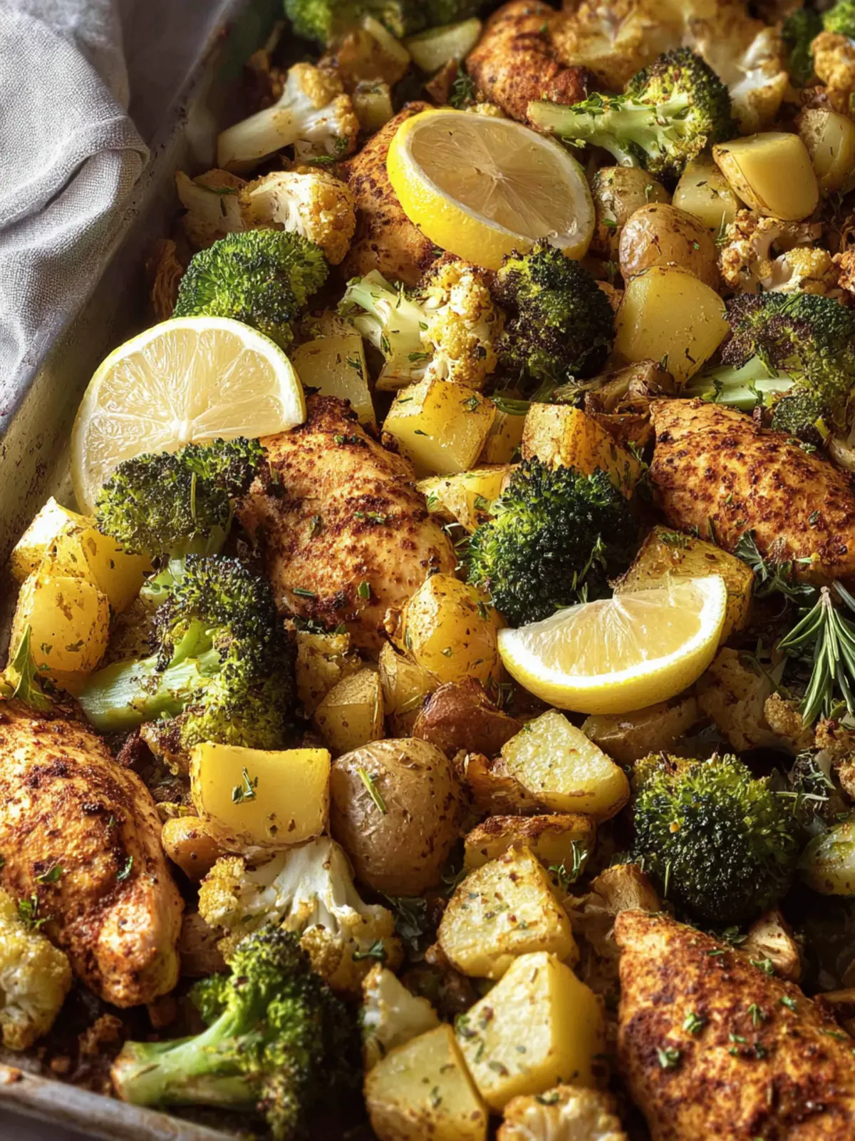 - In a large bowl or directly on the sheet pan in a single layer, combine the chicken, broccoli, cauliflower, and potatoes with the olive oil and seasoning blend. Toss until everything is well coated. Make space for the lemon wedges and add them to the sheet pan with the chicken and vegetables.