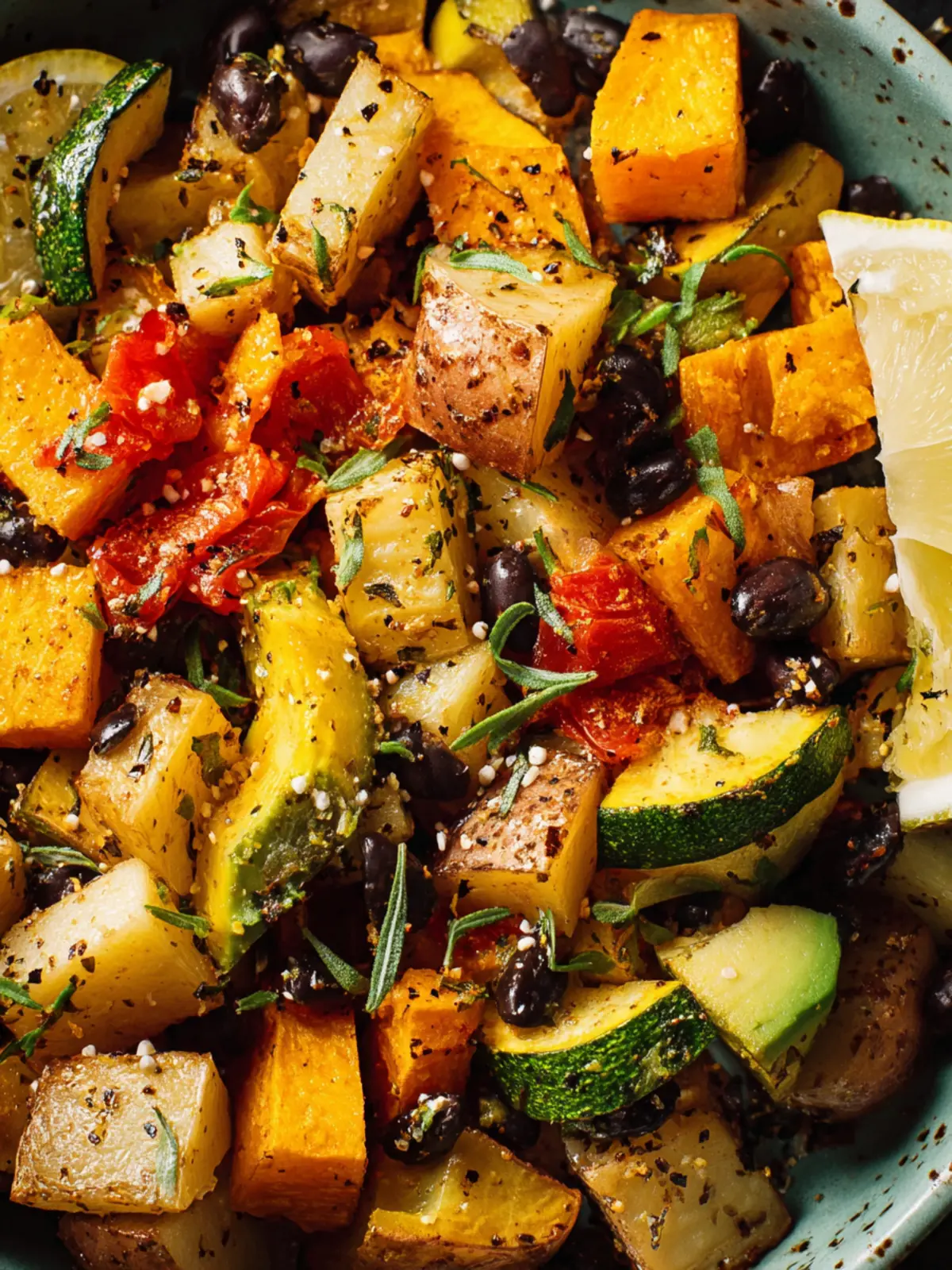 This delicious roasted vegetable medley features Yukon gold potatoes, zucchini, yellow squash, and black beans, all tossed in pesto and roasted to perfection.