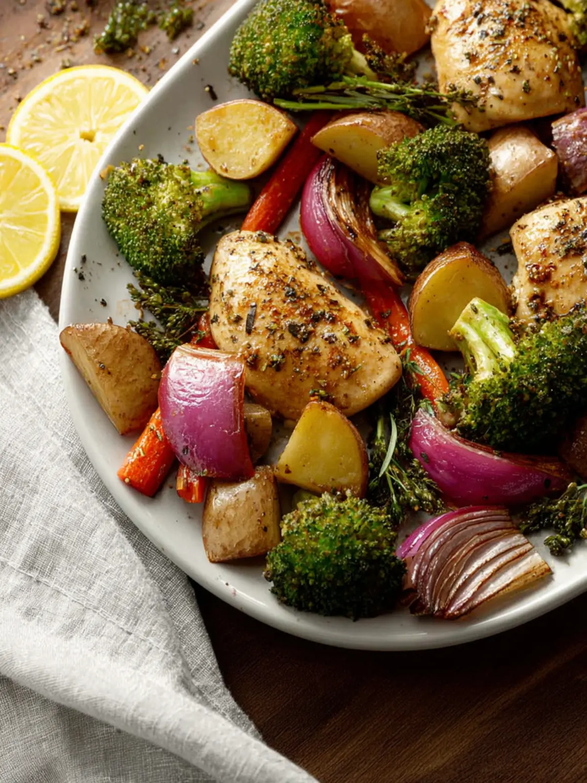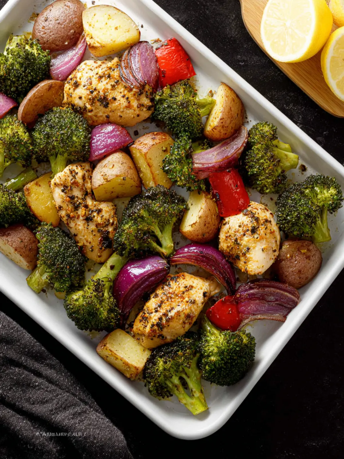 A delicious and healthy oven-baked dish featuring chicken, potatoes, and broccoli, seasoned with fresh lemon.