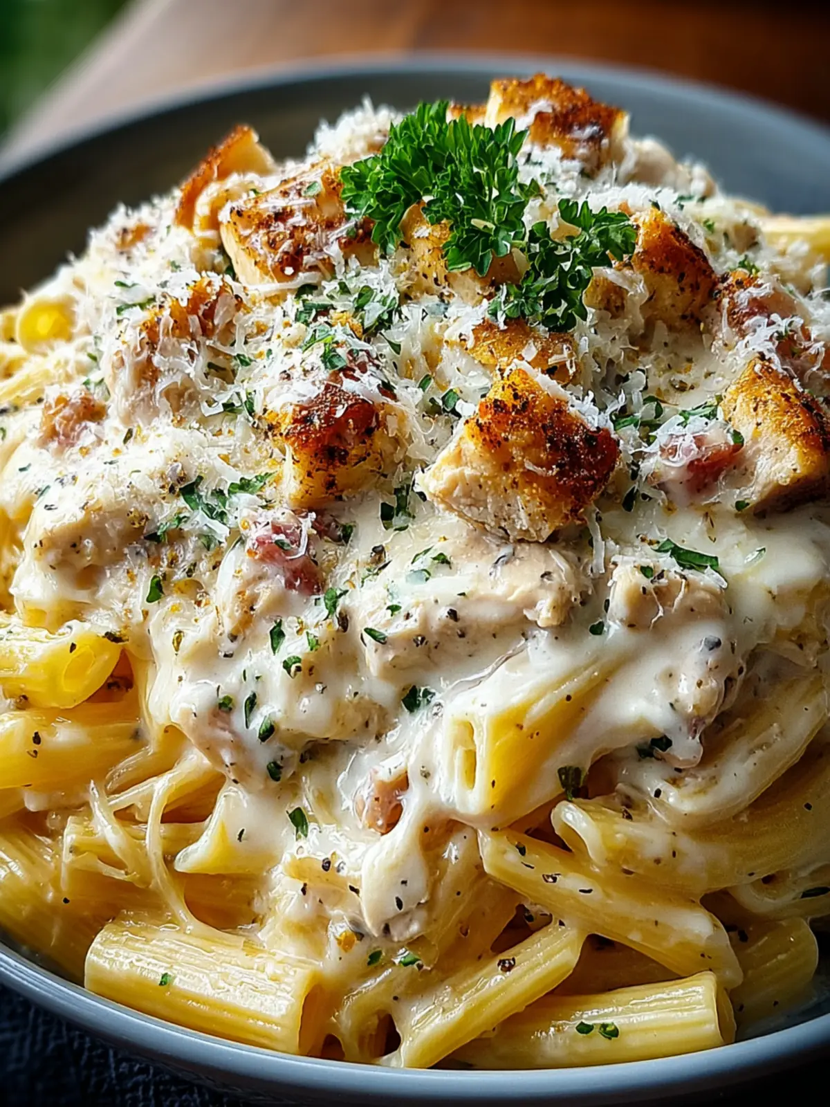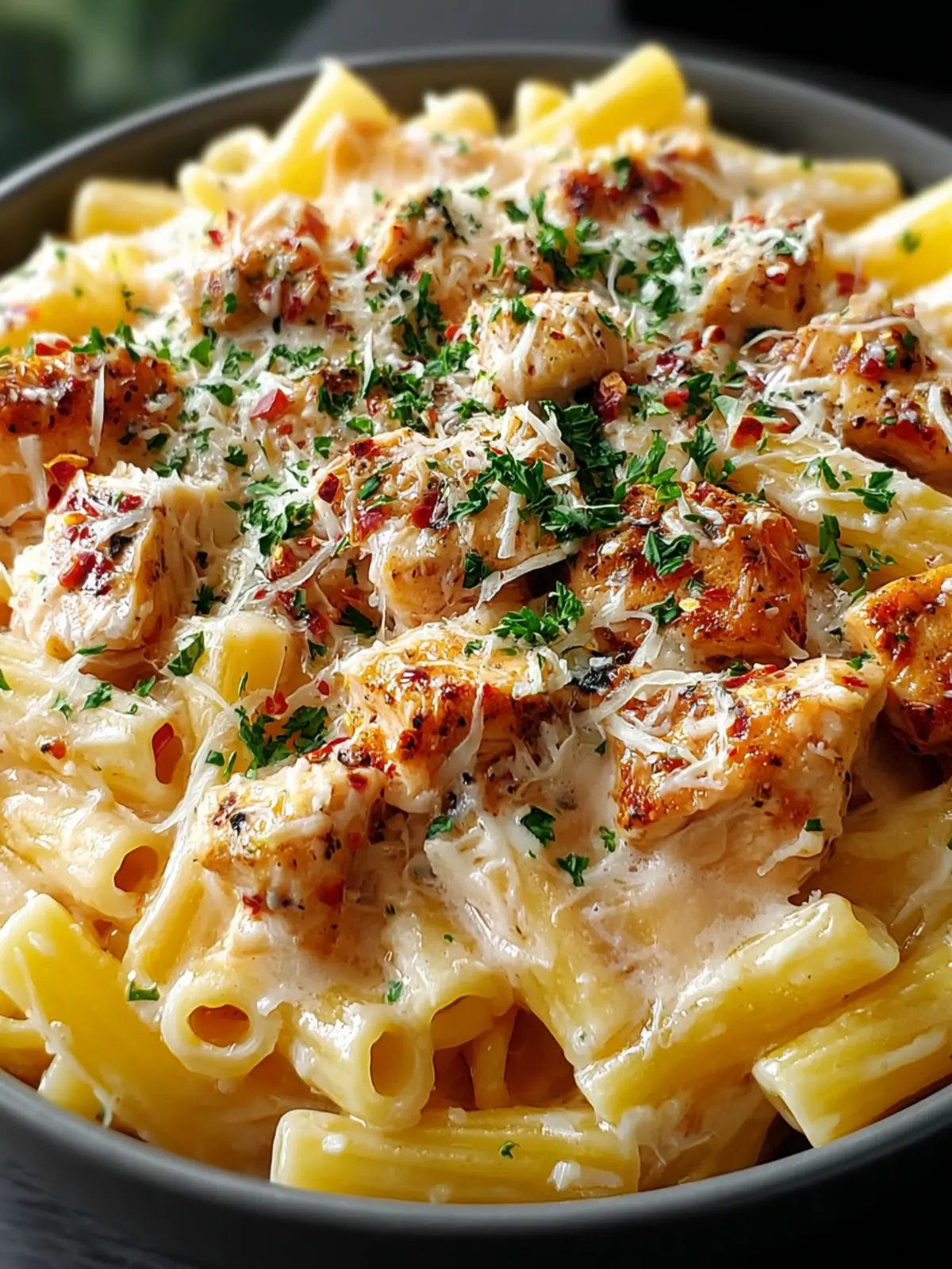 A deliciously creamy pasta dish featuring tender chicken and garlic.