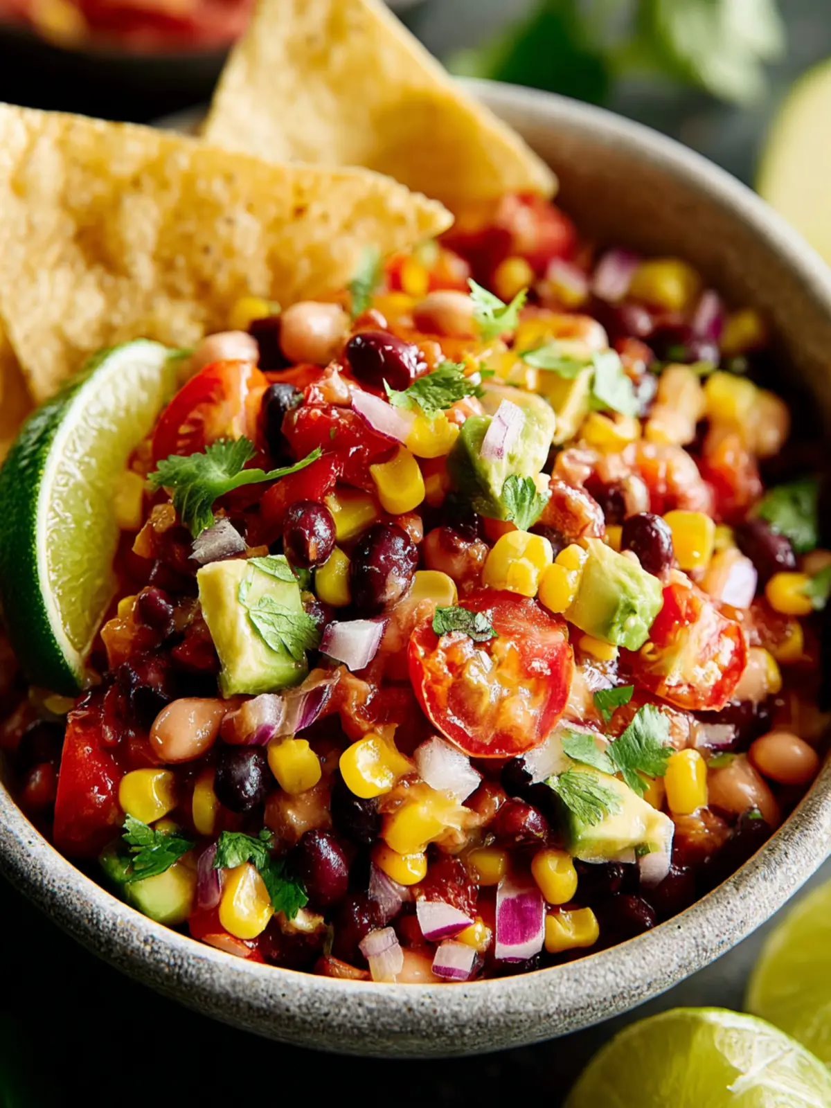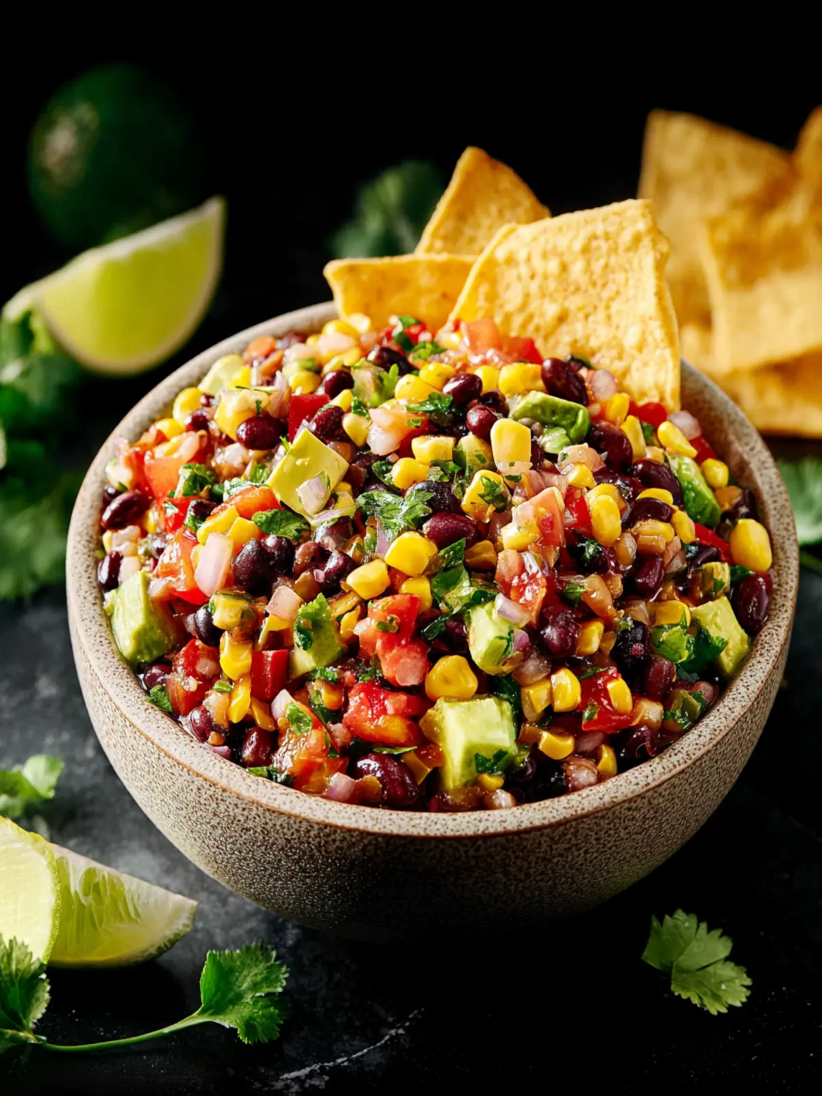 A refreshing salad with black beans, corn, cherry tomatoes, and ripe avocados, perfect for any occasion.